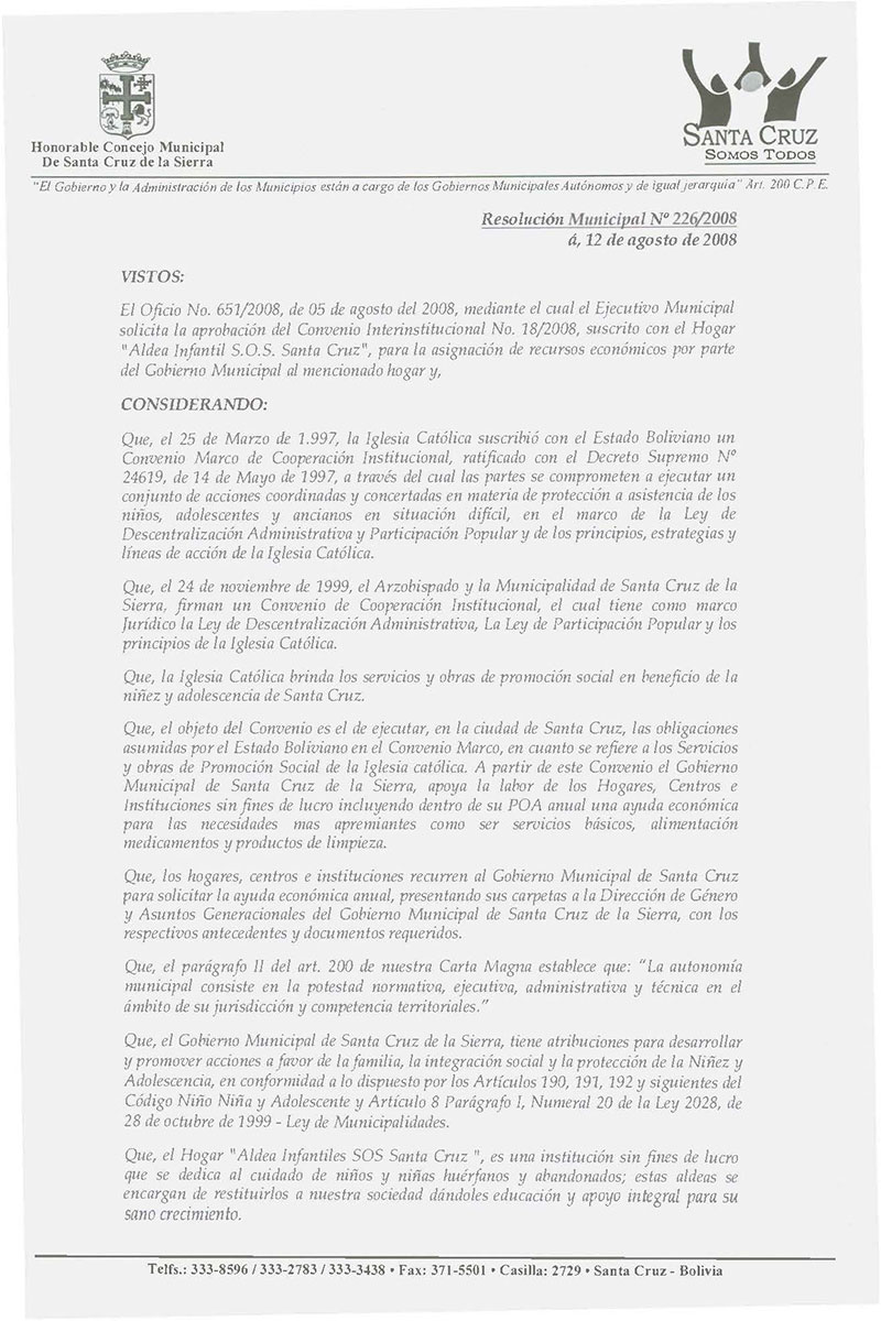 Aprueba el Convenio Interinstitucional Nº 018/2008, suscrito entre el Gobierno Municipal de la Ciudad de Santa Cruz de la Sierra y el Hogar "Aldea Infantil S.O.S. Santa Cruz ", en beneficio de los Niños y Niñas y Adolescentes del referido Hogar.
