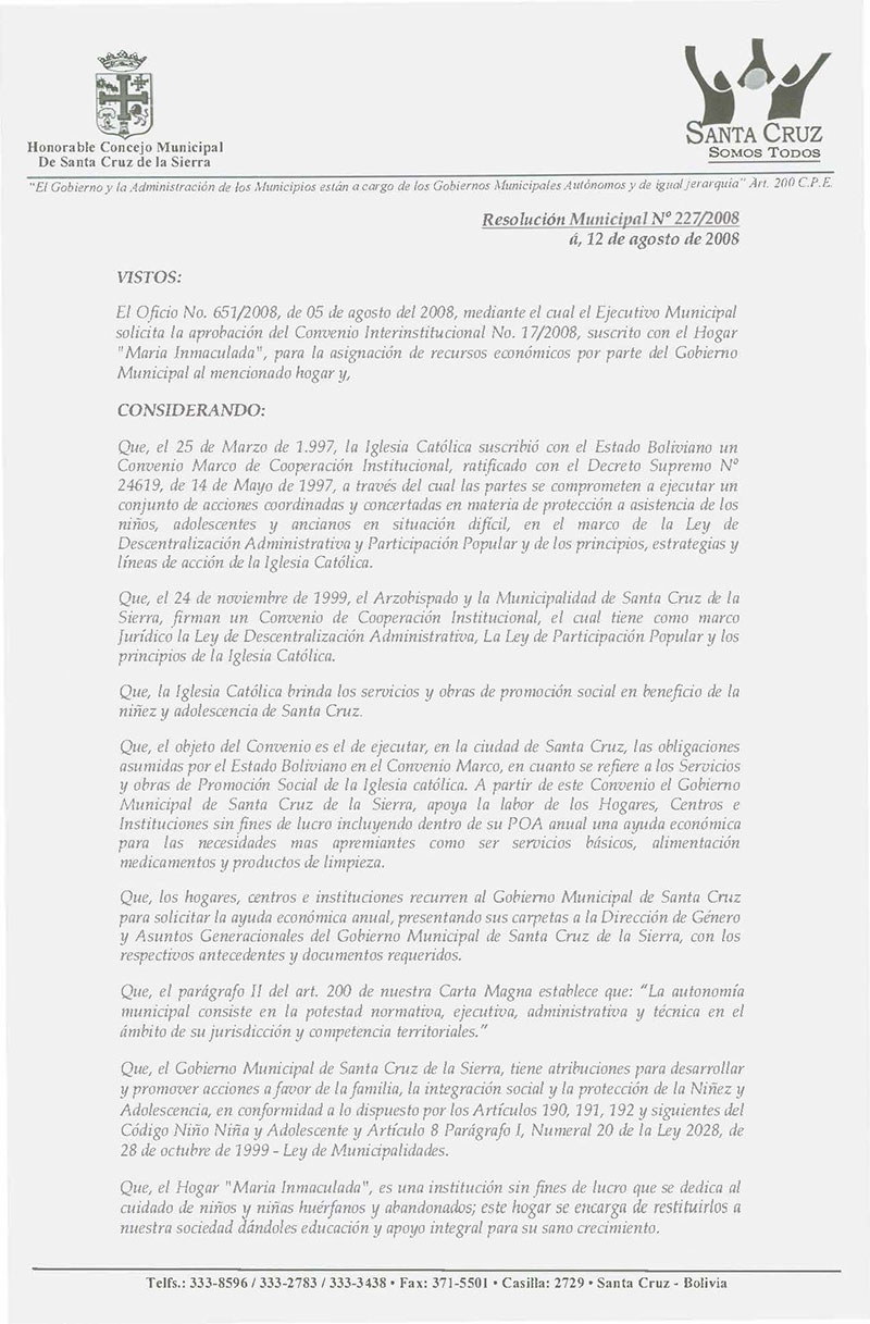 Aprueba el Convenio Interinstitucional Nº 17/2008, suscrito entre el Gobierno Municipal de la Ciudad de Santa Cruz de la Sierra y el Hogar "Maria Inmaculada", en beneficio de los Niños y Niñas y Adolescentes del referido Hogar.