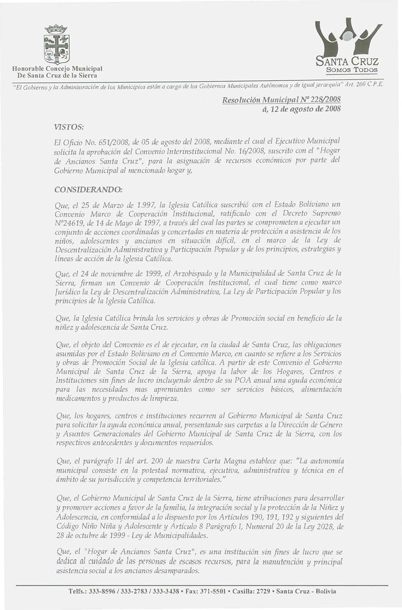 Aprueba el Convenio Interinstitucional Nº 16/2008, suscrito entre el Gobierno Municipal de la Ciudad de Santa Cruz de la Sierra y el "Hogar de Ancianos Santa Cruz", en beneficio de los Ancianos del referido Hogar.