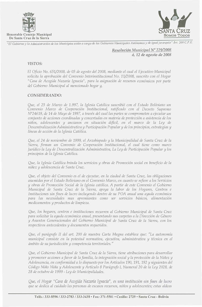 Aprueba el Convenio Interinstitucional Nº 11/2008, suscrito entre el Gobierno Municipal de la ciudad de Santa Cruz de la Sierra y el Hogar "Casa de Acogida Nazaria Ignacia", en beneficio de los Niños y Niñas y Adolescentes del referido Hogar.