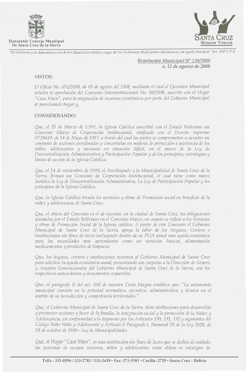 Aprueba el Convenio Interinstitucional Nº 09/2008, suscrito entre el Gobierno Municipal de la ciudad de Santa Cruz de la Sierra y el Hogar "Casa Main", en beneficio de los Niños y Niñas y Adolescentes del referido Hogar.