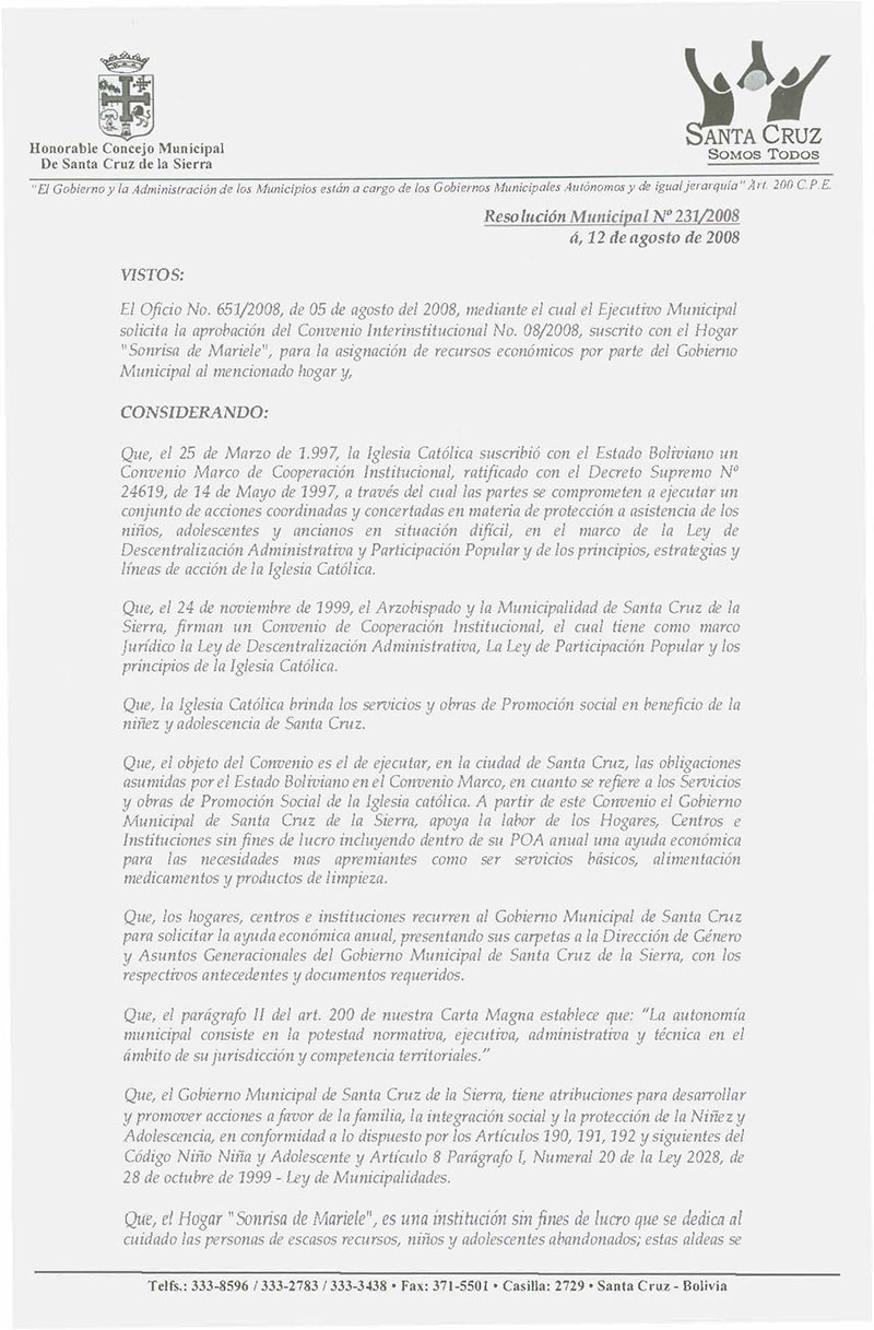 Aprueba el Convenio Interinstitucional Nº 08/2008, suscrito entre el Gobierno Municipal de la ciudad de Santa Cruz de la Sierra y el Hogar "Sonrisa de Mariele", en beneficio de los Niños y Niñas y Adolescentes del referido Hogar.