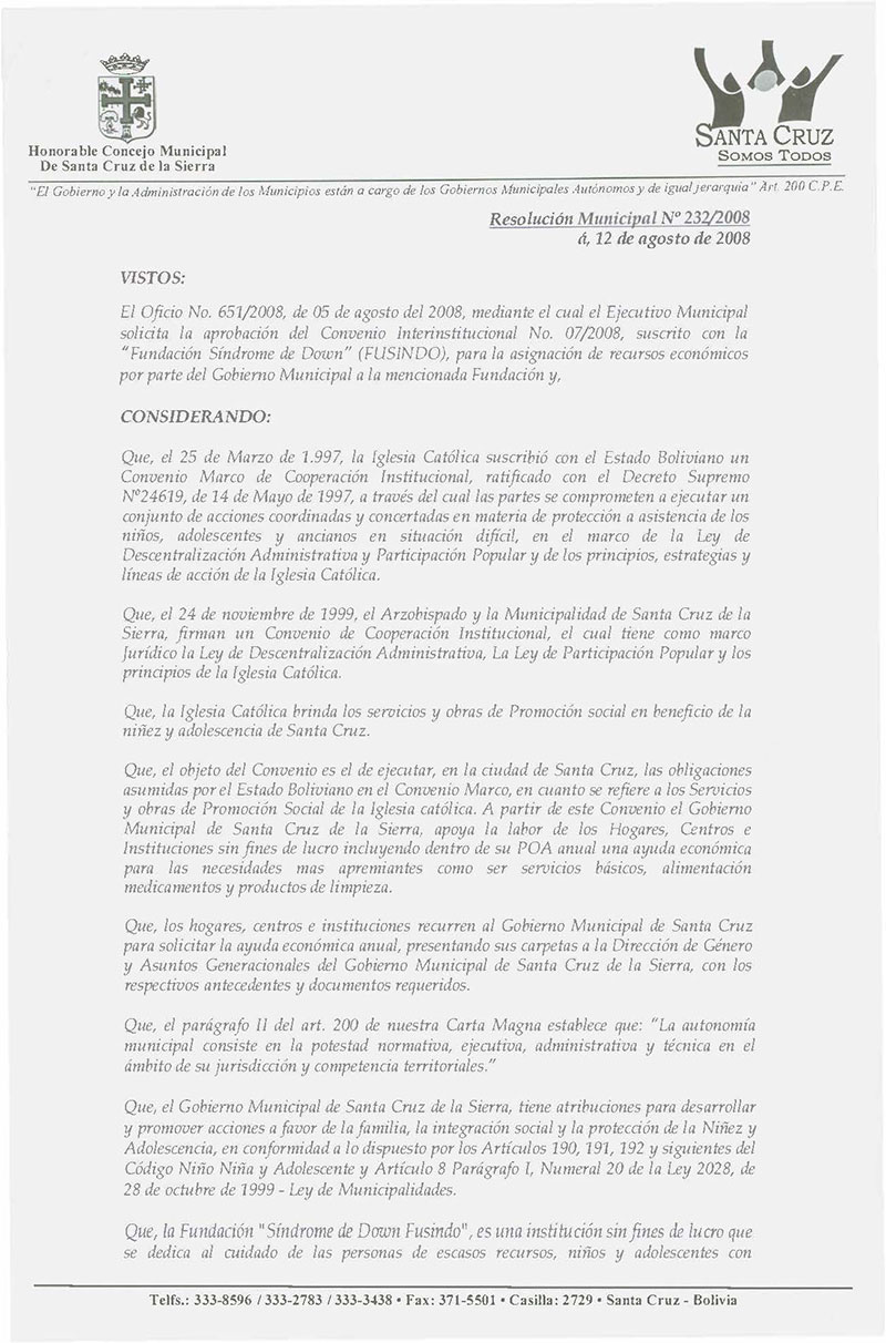 Aprueba el Convenio Interinstitucional Nº 07/2008, suscrito entre el Gobierno Municipal de la ciudad de Santa Cruz de la Sierra y la Fundación "Síndrome de Down” (FUSINDO), en beneficio de los Niños y Niñas y Adolescentes de la referida Fundación.