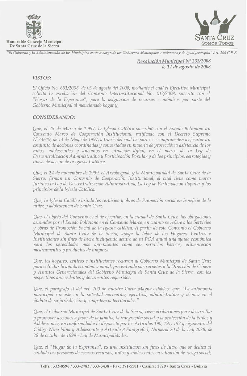 Aprueba el Convenio Interinstitucional Nº 12/2008, suscrito entre el Gobierno Municipal de la ciudad de Santa Cruz de la Sierra y el "Hogar de la Esperanza", en beneficio de los Niños y Niñas y Adolescentes del referido Hogar.