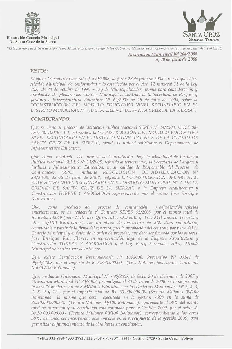 Aprueba el contrato de la Secretaria de Parques y Jardines e Infraestructura Educativa Nº 62/2008 para la “CONSTRUCCIÓN DEL MODULO EDUCATIVO NIVEL SECUNDARIO EN EL DISTRITO MUNICIPAL Nº 7, DE LA CIUDAD DE SANTA CRUZ DE LA SIERRA”, por el monto total de Bs. 6.583.132.49.- (SEIS MILLONES QUINIENTOS OCHENTA Y TRES MIL CIENTO TREINTA Y DOS 49/100 BOLIVIANOS) a suscribirse con la Empresa Arquitectura y Construcción TURERE Y ASOCIADOS.