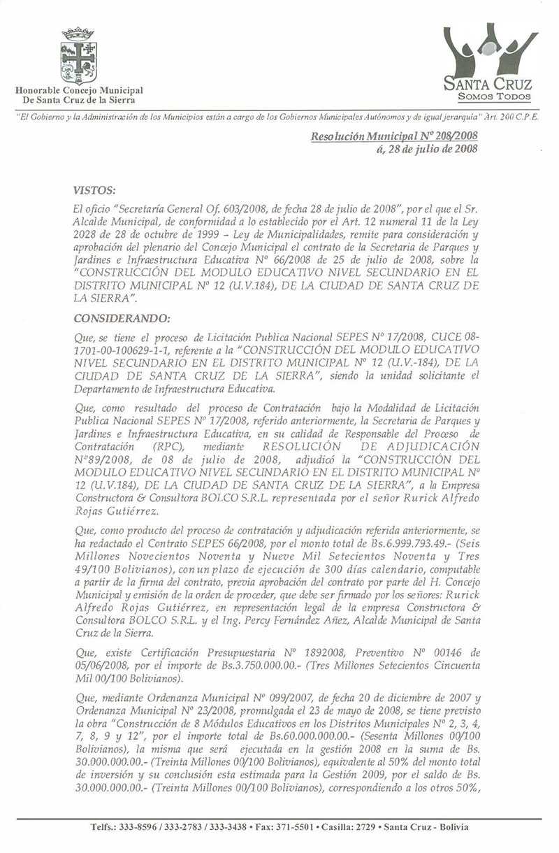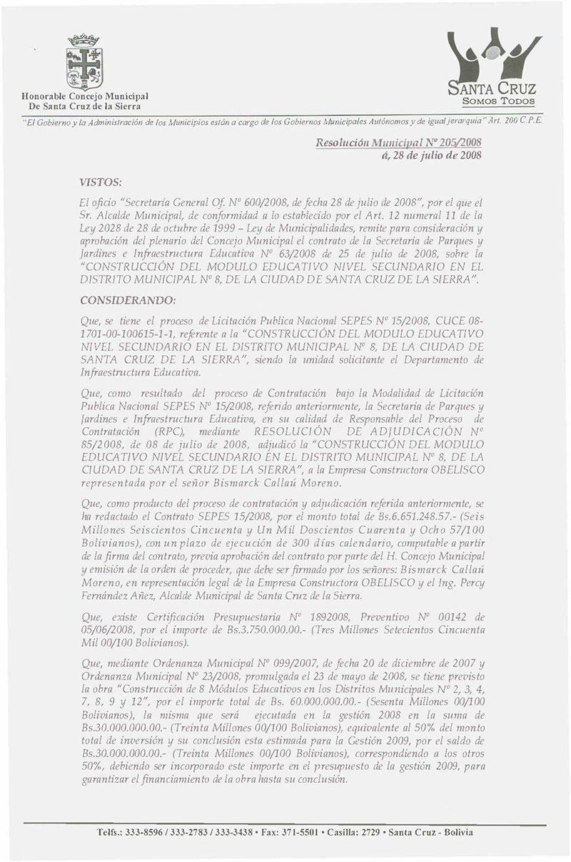 Aprueba el contrato de la Secretaria de Parques y Jardines e Infraestructura Educativa Nº 62/2008 para la “CONSTRUCCIÓN DEL MODULO EDUCATIVO NIVEL SECUNDARIO EN EL DISTRITO MUNICIPAL Nº 8, DE LA CIUDAD DE SANTA CRUZ DE LA SIERRA”, por el monto total de Bs. 6.651.248.57.- (SEIS MILLONES SEISCIENTOS CINCUENTA Y UN MIL DOSCIENTOS CUARENTA Y OCHO 57/100 BOLIVIANOA), a suscribirse con la Empresa Constructora OBELISCO Ltda.