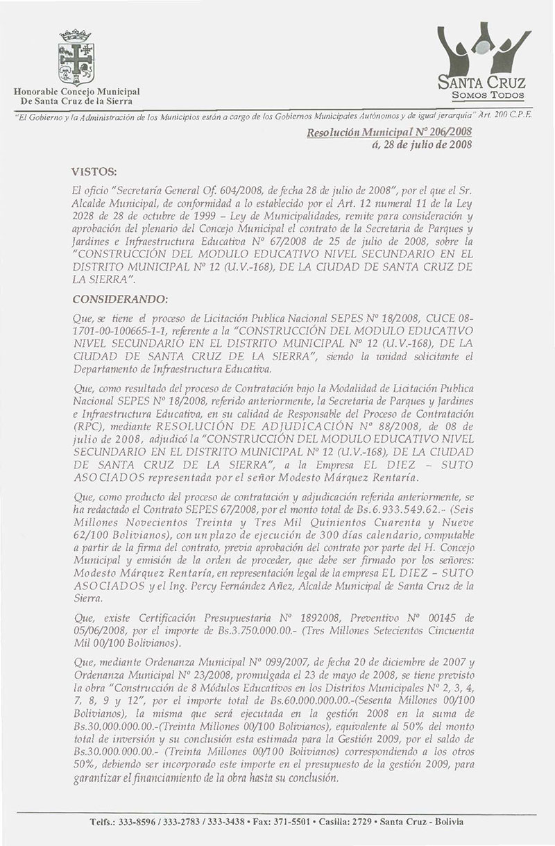 Aprueba el contrato de la Secretaria de Parques y Jardines e Infraestructura Educativa Nº 67/2008 para la “CONSTRUCCIÓN DEL MODULO EDUCATIVO NIVEL SECUNDARIO EN EL DISTRITO MUNICIPAL Nº 12 (U.V.-168), DE LA CIUDAD DE SANTA CRUZ DE LA SIERRA”, por el monto total de Bs. 6.933.549.62 (SEIS MILLONES NOVECIENTOS TREINTA Y TRES MIL QUINIENTOS CUARENTA Y NUEVE 62/100 BOLIVIANO) a suscribirse con la empresa EL DIEZ – SUTO ASOCIADOS.