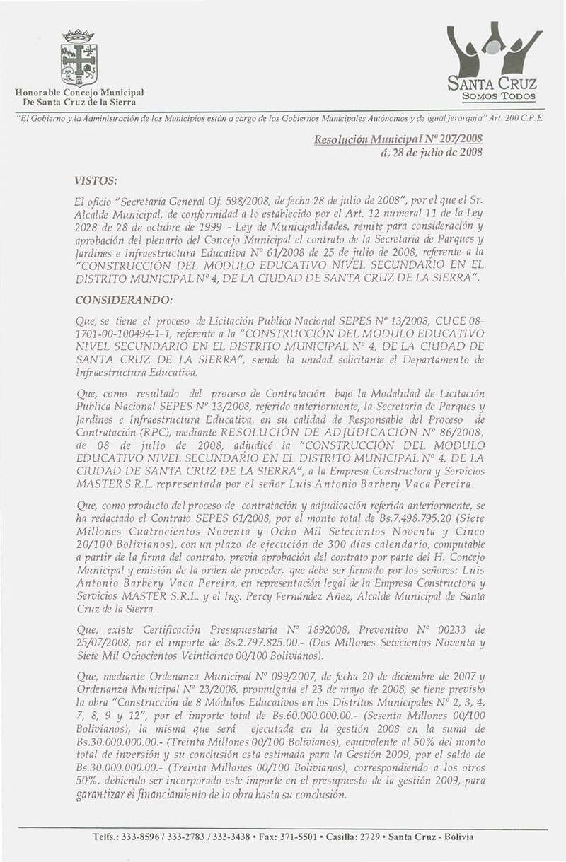 Aprueba el contrato de la Secretaria de Parques y Jardines e Infraestructura Educativa Nº 61/2008 para la “CONSTRUCCIÓN DEL MODULO EDUCATIVO NIVEL SECUNDARIO EN EL DISTRITO MUNICIPAL Nº 4, DE LA CIUDAD DE SANTA CRUZ DE LA SIERRA”, por el monto total de Bs. 7.498.795.20.- (SIETE MILLONES CUATROCIENTOS NOVENTA Y OCHO MIL SETECIENTOS NOVENTA Y CINCO 20/100 BOLIVIANOS) a suscribirse con la Empresa Constructora y Servicios MASTER S.R.L.