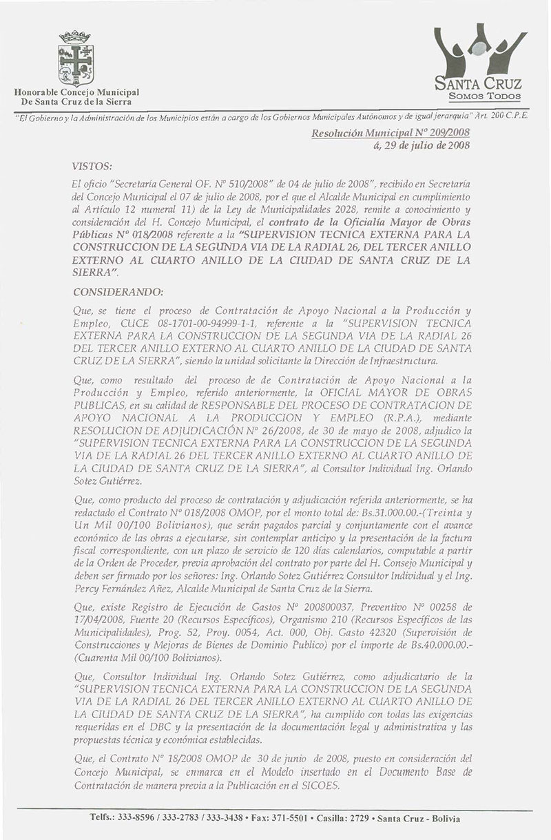 Aprueba el contrato de la Oficialía Mayor de Obras Públicas Nº018/2008, por el monto total de Bs. 31.000.00.-(TREINTA Y ÚN MIL 00/100 BOLIVIANOS), para la “SUPERVISIÓN TÉCNICA EXTERNA PARA LA CONSTRUCCIÓN DE LA SEGUNDA VÍA DE LA RADIAL 26 DEL TERCER ANILLO EXTERNO AL CUARTO ANILLO DE LA CIUDAD DE SANTA CRUZ DE LA SIERRA”.