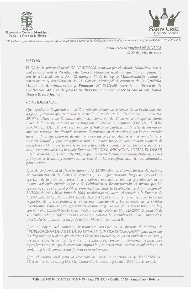 Aprueba el Contrato de la Oficialía Mayor de Administración y Finanzas Nº 034/2008, referente al Servicio de “Servicio de Publicación de arte de prensa en diversos tamaños”, suscrito con la la Empresa de “COMUNICACIÓN SOCIAL EL DEBER S.A.”, por un monto de Bs. 352.554.84 (TRESCIENTOS CINCUENTA Y DOS MIL QUINIENTOS CINCUENTA Y CUATRO 84/100 BOLIVIANOS).