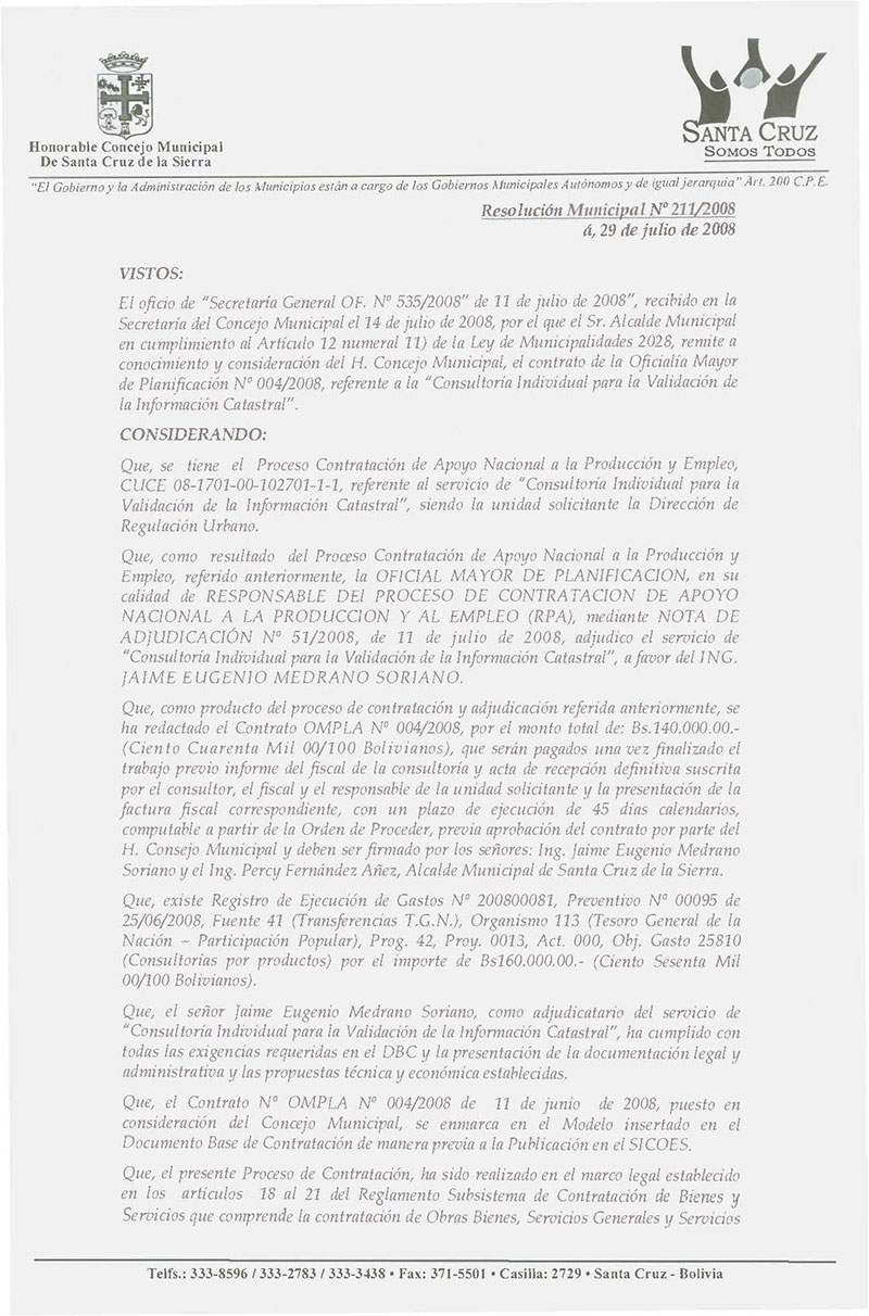 Aprueba el Contrato de la Oficialía Mayor de Planificación Nº 004/2008, por el monto de Bs. 140,000,00 (Ciento Cuarenta Mil 00/100 Bolivianos), para el servicio de Consultoria Individual, para la validación de la Información Catastral a suscribirse con el Sr. Ing. Jaime Eugenio Medrano Soriano.