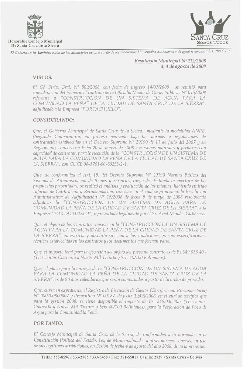 Aprueba el Contrato de la Oficialía Mayor de Obras Públicas Nº015/2008 referente a “CONSTRUCCIÓN DE UN SISTEMA DE AGUA PARA LA COMUNIDAD LA PEÑA, DE LA CIUDAD DE SANTA CRUZ DE LA SIERRA”, adjudicado a la Empresa “PORTACHUELO”, por el importe de Bs. 349.036.40.- (TRESCIENTOS CUARENTA Y NUEVE MIL TREINTA Y SEIS 40/100 BOLIVIANOS).