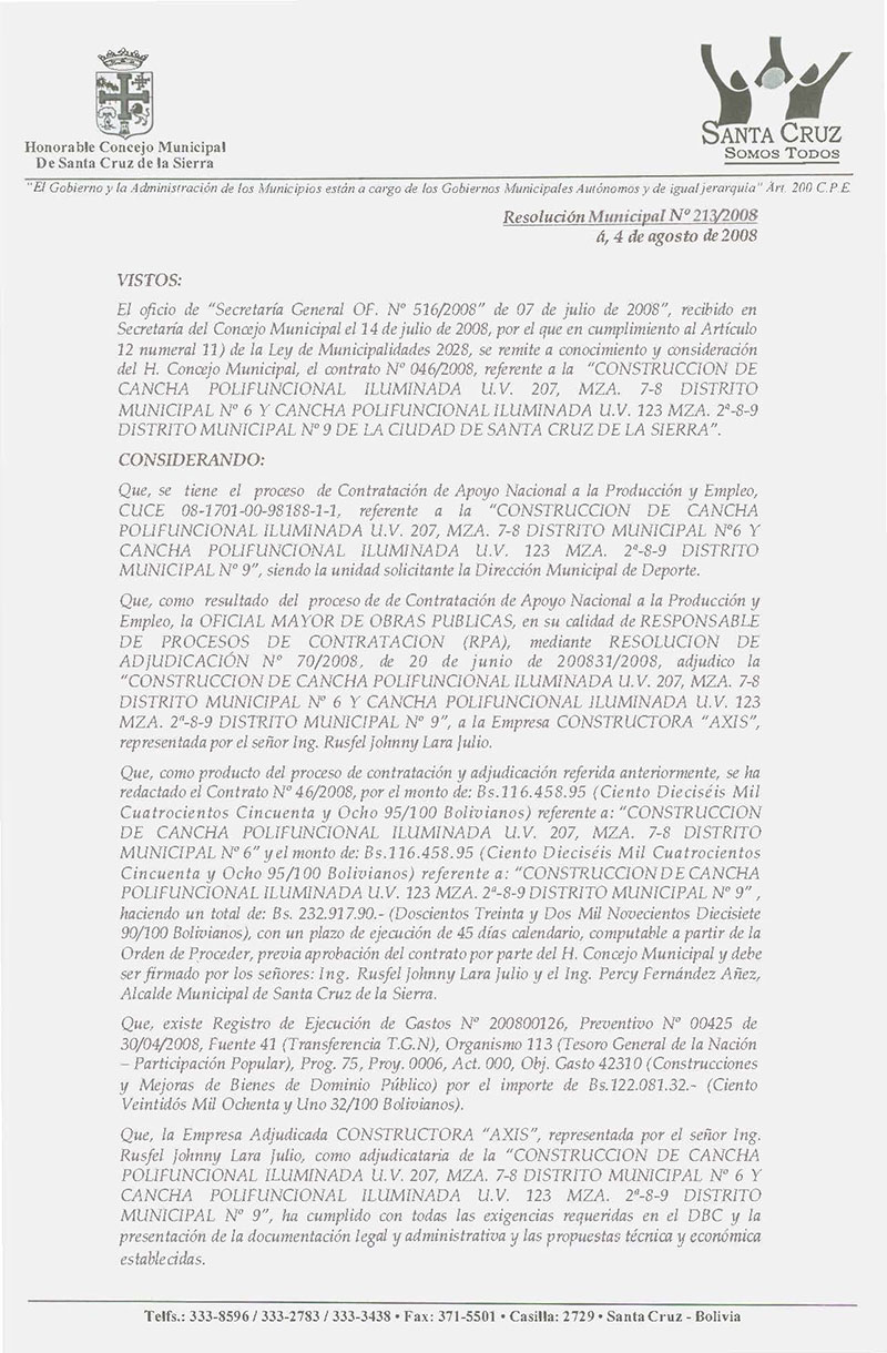 Aprueba el Contrato Nº 46/2008, para la “CONSTRUCCION DE CANCHA POLIFUNCIONAL ILUMINADA U.V. 207, MZA. 7-8 DISTRITO MUNICIPAL Nº 6” por el monto de Bs. 116.458.95.- (Ciento Dieciséis Mil Cuatrocientos Cincuenta y Ocho 95/100 Bolivianos) y para la “CONSTRUCCIÓN DE CANCHA POLIFUNCIONAL ILUMINADA U.V. 123 MZA. 2ª-8-9 DISTRITO MUNICIPAL Nº 9” por el monto total de Bs. 232.917.90.- (DOSCIENTOS TREINTA Y DOS MIL NOVECIENTOS DIECISIETE 90/100 BOLIVIANOS), adjudicada a la Empresa Constructora AXIS.