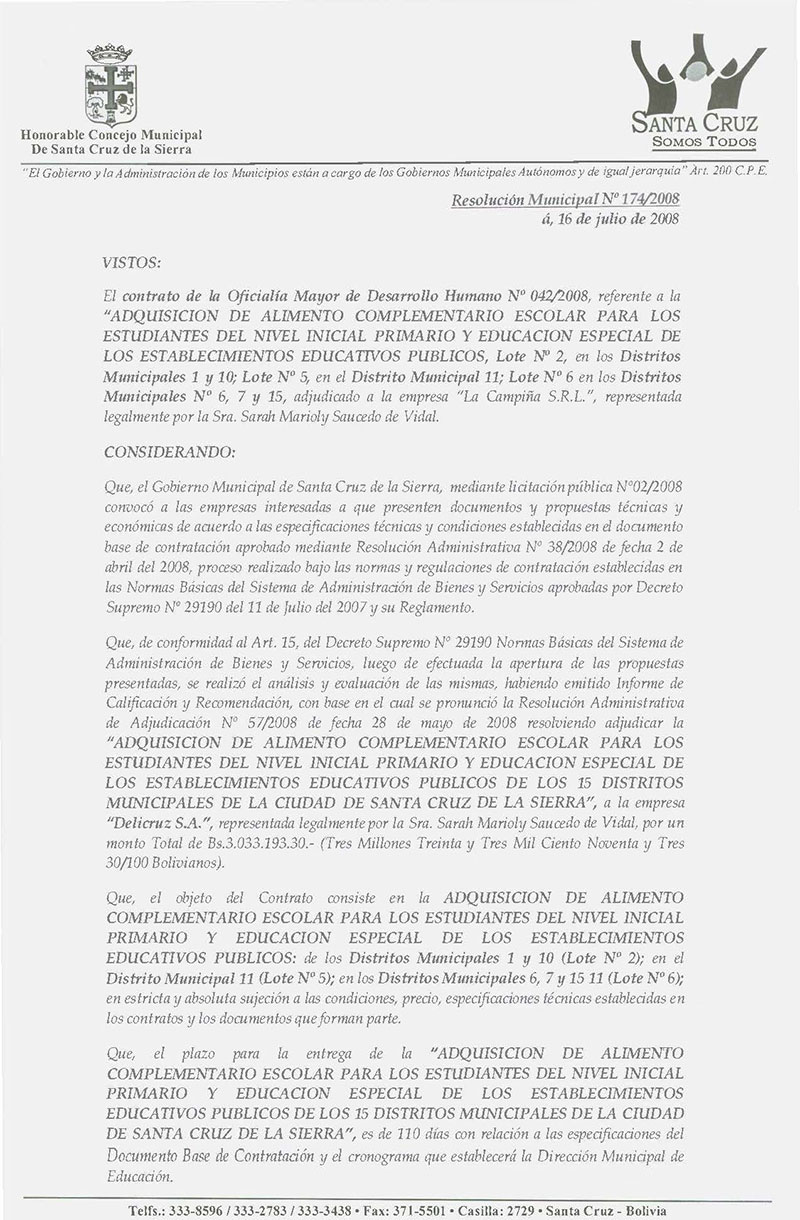 Se aprueba el Contrato de la Oficialía Mayor de Desarrollo Humano Nº 042/2008, referente a la “ADQUISICION DE ALIMENTO COMPLEMENTARIO ESCOLAR PARA LOS ESTUDIANTES DEL NIVEL INICIAL PRIMARIO Y EDUCACION ESPECIAL DE LOS ESTABLECIMIENTOS EDUCATIVOS PUBLICOS”, adjudicado a la Empresa Productos Lácteos “La Campiña S.R.L”, representada legalmente por la Sra. Sarah Marioly Saucedo de Vidal, adjudicado por el importe de Bs.3.033.193.30.- (Tres Millones Treinta y Tres Mil Ciento Noventa y Tres 30/100 Bolivianos).
