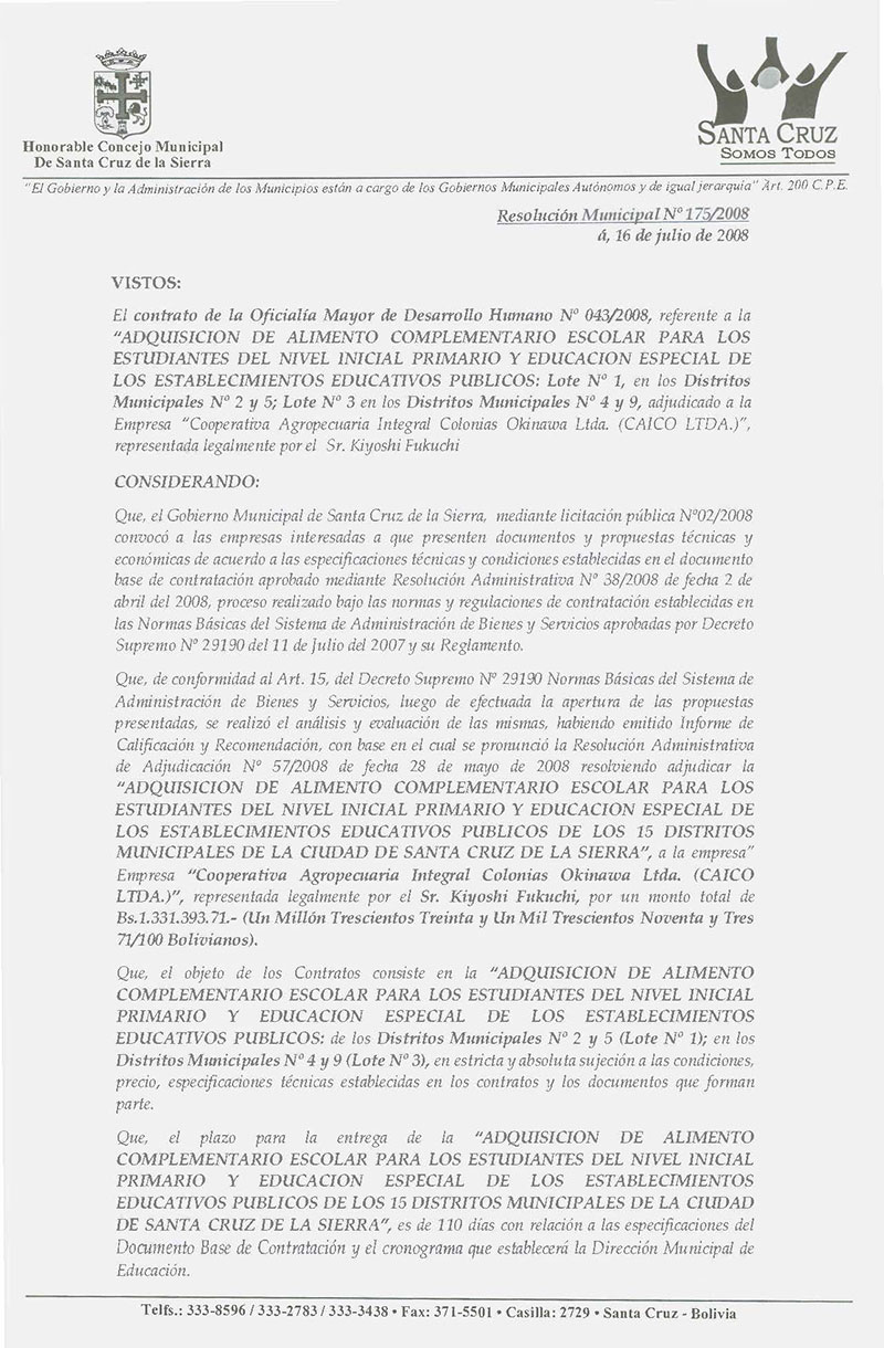 Se aprueba el contrato de la Oficialía Mayor de Desarrollo Humano Nº 043/2008, referente a la “ADQUISICION DE ALIMENTO COMPLEMENTARIO ESCOLAR PARA LOS ESTUDIANTES DEL NIVEL INICIAL PRIMARIO Y EDUCACION ESPECIAL DE LOS ESTABLECIMIENTOS EDUCATIVOS PUBLICOS”, adjudicado a la Empresa “Cooperativa Agropecuaria Integral Colonias Okinawa Ltda. (CAICO LTDA.)”, representada legalmente por el Sr. Kiyoshi Fukuchi, por un monto total de Bs.1.331.393.71.- (Un Millón Trescientos Treinta y Un Mil Trescientos Noventa y Tres 71/100 Bolivianos).