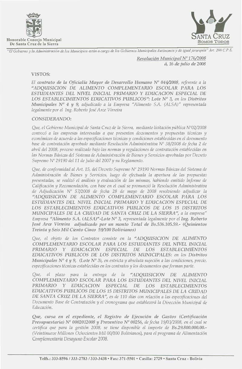 Aprueba el Contrato de la Oficialía Mayor de Desarrollo Humano Nº 044/2008, referente a la “ADQUISICIÓN DE ALIMENTO COMPLEMENTARIO ESCOLAR PARA LOS ESTUDIANTES DEL NIVEL INICIAL PRIMARIO Y EDUCACIÓN ESPECIAL DE LOS ESTABLECIMIENTOS EDUCATIVOS PÚBLICOS”, adjudicado a la Empresa “Alimento S.A. (ALSA)”, por un monto Total de Bs. 536.105.59.- (Quinientos Treinta y Seis Mil Ciento Cinco 59/100 Bolivianos).