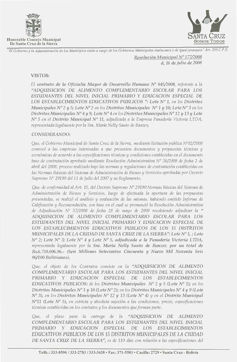 Aprueba el Contrato de la Oficialía Mayor de Desarrollo Humano Nº 045/2008, referente a la “ADQUISICIÓN DE ALIMENTO COMPLEMENTARIO ESCOLAR PARA LOS ESTUDIANTES DEL NIVEL INICIAL PRIMARIO Y EDUCACIÓN ESPECIAL DE LOS ESTABLECIMIENTOS EDUCATIVOS PÚBLICOS”, adjudicado a la Empresa “Panadería Victoria LTDA” , por un monto total de Bs. 6.759.096.96.- (Seis Millones Setecientos Cincuenta y Nueve Mil Noventa Seis 96/100 Bolivianos).