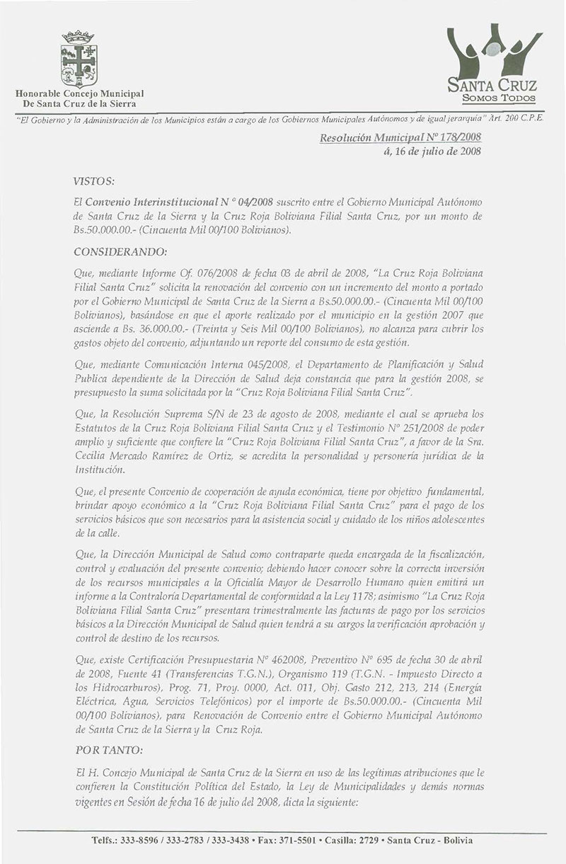 Aprueba el Convenio Interinstitucional de Cooperación Nº 04/2008 suscrito entre el Gobierno Municipal Autónomo de Santa Cruz de la Sierra y la Cruz Roja Boliviana Filial Santa Cruz, por un monto de Bs. 50.000.00.- (Cincuenta Mil 00/100 Bolivianos).