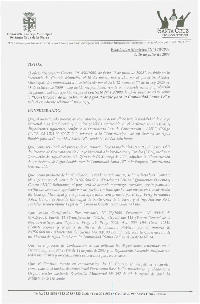 Aprueba el Contrato Nº 13/2008 de 03 de junio de 2008, por el valor de Bs 206.584.63.- (Doscientos Seis Mil Quinientos Ochenta y Cuatro 63/100 Bolivianos), para la “Construcción de un Sistema de Agua Potable para la Comunidad Santa Fe”, adjudicado a la “Empresa Constructora Guarini Ltda.”.