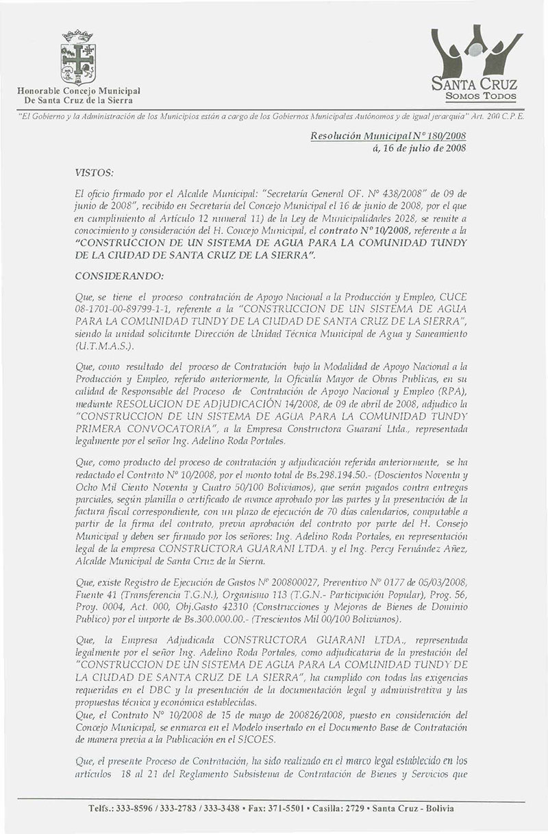 Aprueba el Contrato de la Oficialía Mayor de Obras Públicas Nº 10/2008, por el monto total de de Bs .298.194.50.- (Doscientos Noventa y Ocho Mil Ciento Noventa y Cuatro 50/100 Bolivianos), para la “CONSTRUCCIÓN DE UN SISTEMA DE AGUA PARA LA COMUNIDAD TUNDY DE LA CIUDAD DE SANTA CRUZ DE LA SIERRA” a suscribirse con la empresa CONSTRUCTORA GUARANI LTDA.