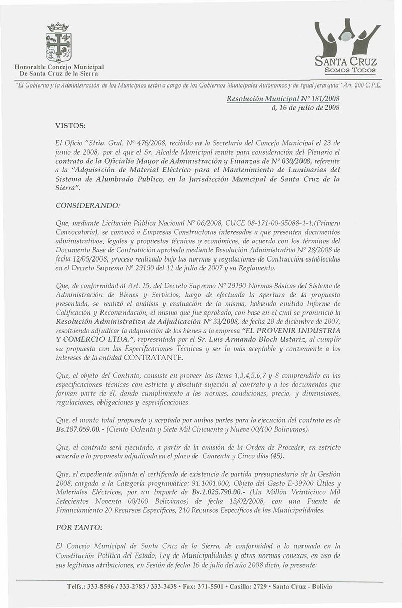 Aprueba el Contrato de la Oficialía Mayor de Administración y Finanzas Nº 30/2008, referente a la “Adquisición de Material Eléctrico para el Mantenimiento de Luminarias del Sistema de Alumbrado Publico, en la Jurisdicción Municipal de Santa Cruz de la Sierra”, adjudicado a la Empresa “El Porvenir Industria y Comercio Ltda.” Por un monto de Bs. 187.059.00.- (Ciento Ochenta y Siete Mil Cincuenta y Nueve 00/100 Bolivianos).