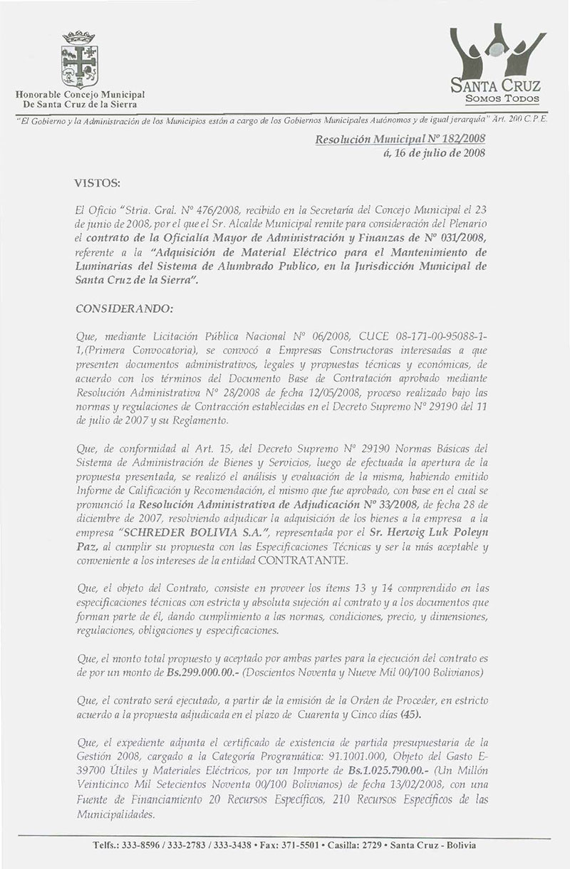 Aprueba el Contrato de la Oficialía Mayor de Administración y Finanzas de Nº 031/2008, referente a la “Adquisición de Material Eléctrico para el Mantenimiento de Luminarias del Sistema de Alumbrado Publico, en la Jurisdicción Municipal de Santa Cruz de la Sierra”, adjudicado a la Empresa “SCHEREDER BOLIVIA S.A.”, por un monto de Bs. 299.000.00.- (Doscientos Noventa y Nueve Mil 00/100 Bolivianos).