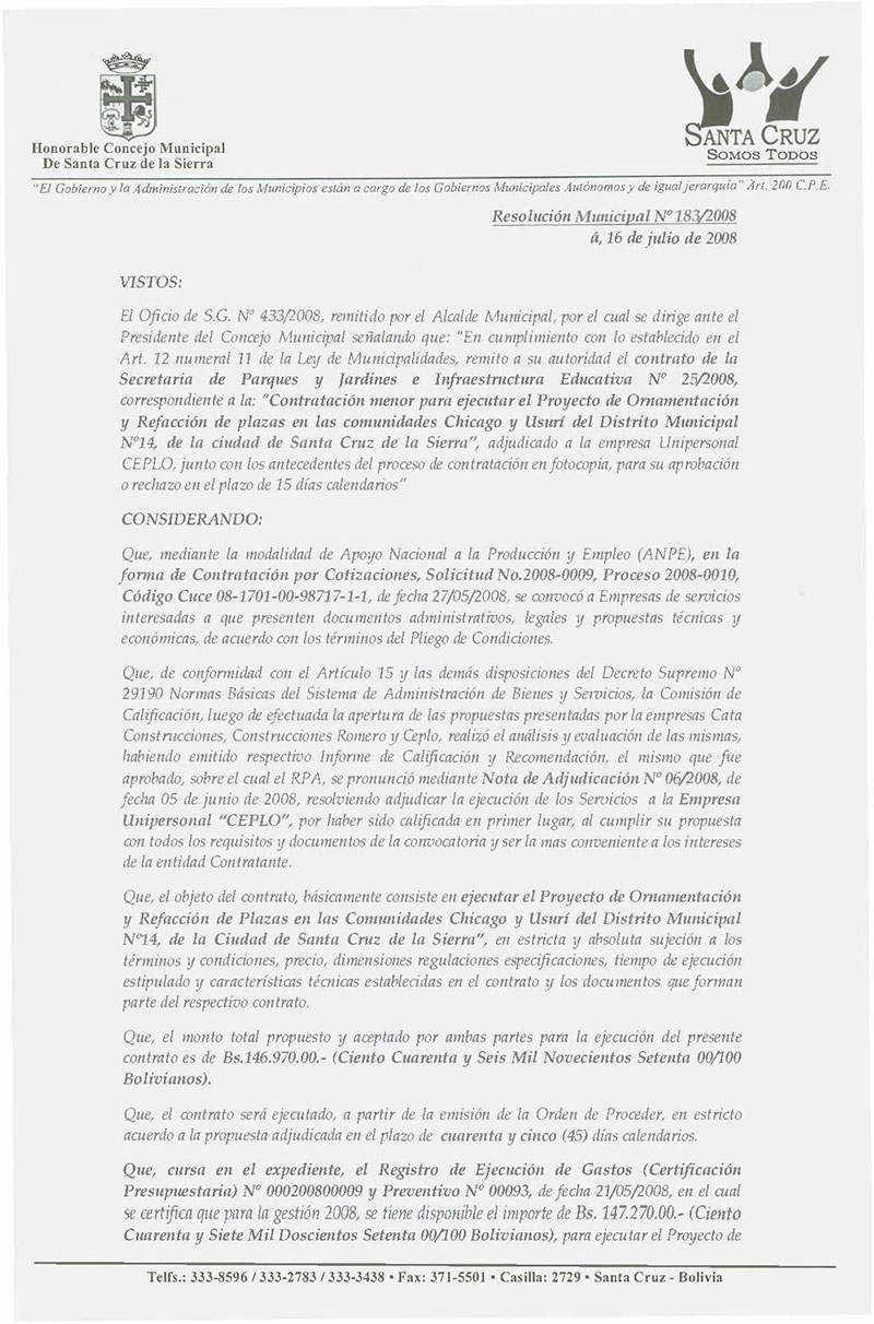 Aprueba el Contrato de la Secretaria de Parques y Jardines e Infraestructura Educativa Nº 25/2008, referente a la “Contratación menor para ejecutar el Proyecto de Ornamentación y Refacción de plazas en las comunidades Chicago y Usurí del Distrito Municipal Nº 14, de la ciudad de Santa Cruz de la Sierra”, adjudicado a la empresa unipersonal:”CEPLO”, por un monto de Bs. 146.970.00.- (Ciento Cuarenta y Seis Mil Novecientos Setenta 00/100 Bolivianos).