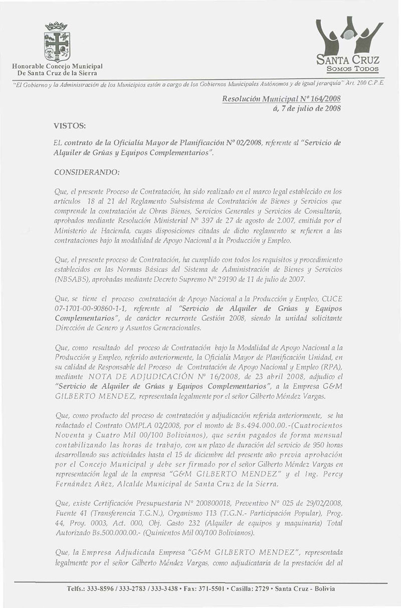 Aprueba el contrato de la Oficialía Mayor de Planificación Nº 02/2008, por el monto de Bs. 494.000.00.- (Cuatrocientos Noventa y Cuatro Mil 00/100 Bolivianos), para el “Servicio de Alquiler de Grúas y Equipos Complementarios”, a suscribirse con la empresa “G.