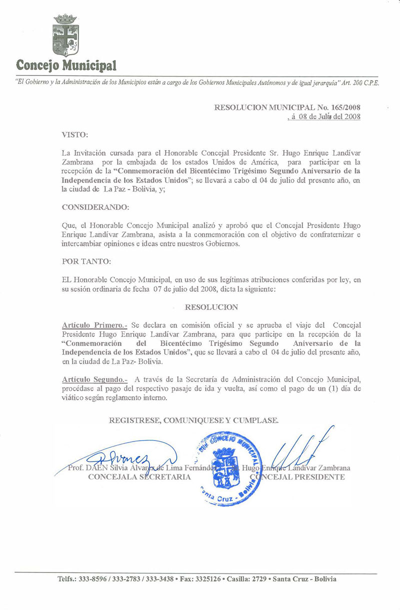 Declara en Comisión oficial y se aprueba el viaje del Concejal Presidente Sr. Hugo Enrique Landivar Zambrana, para participar en la recepción de la CONMEMORACIÓN DEL BICENTENARIO TRIGÉSIMO SEGUNDO ANIVERSARIO DE LA INDEPENDENCIA DE LOS ESTADOS UNIDOS, que se llevará a cabo el 04 de julio del presente año en la ciudad de La Paz.