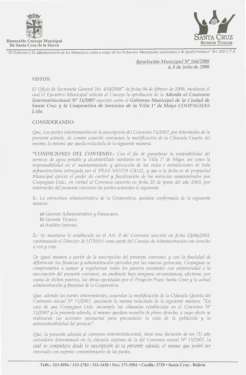 Aprueba la Adenda al Convenio Interinstitucional Nº 11/2007, suscrito entre el Gobierno Municipal de Santa Cruz de la Sierra y La Cooperativa de Servicios Públicos de la Villa 1º de Mayo “COOPAGUAS Ltda., para la Habilitación y Funcionamiento de las Redes de Agua Potable y Alcantarillado Sanitario en la Villa Primero de Mayo.