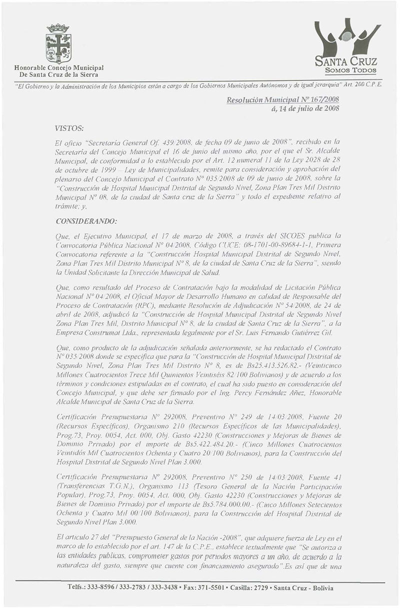 Aprueba el contrato de la Oficialía Mayor de Desarrollo Humano Nº035/2008, por el monto de Bs 25.413.526.82.- (Veinticinco Millones Cuatrocientos Trece Mil Quinientos Veintiséis 82/100 Bolivianos), para la “Construcción de Hospital Municipal Distrital de Segundo Nivel Zona Plan Tres Mil, Distrito Municipal Nº 08”, adjudicado a la Empresa Construmat Ltda.