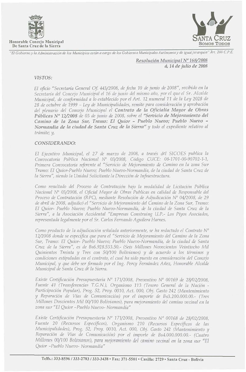 Aprueba el contrato de la Oficialía Mayor de Obras Públicas Nº 12/2008 por el monto de Bs. 6.928.533.50.- (Seis Millones Novecientos Veintiocho Mil Quinientos Treinta y Tres 50/100 Bolivianos), para el “Servicio de Mejoramiento del Camino de la Zona Sur, Tramo El Quior – Pueblo Nuevo; Pueblo Nuevo – Normandía de la ciudad de Santa Cruz de la Sierra”, adjudicado a la Asociación Accidental “Empresas Construing U.P. – Los Piyos Asociados.
