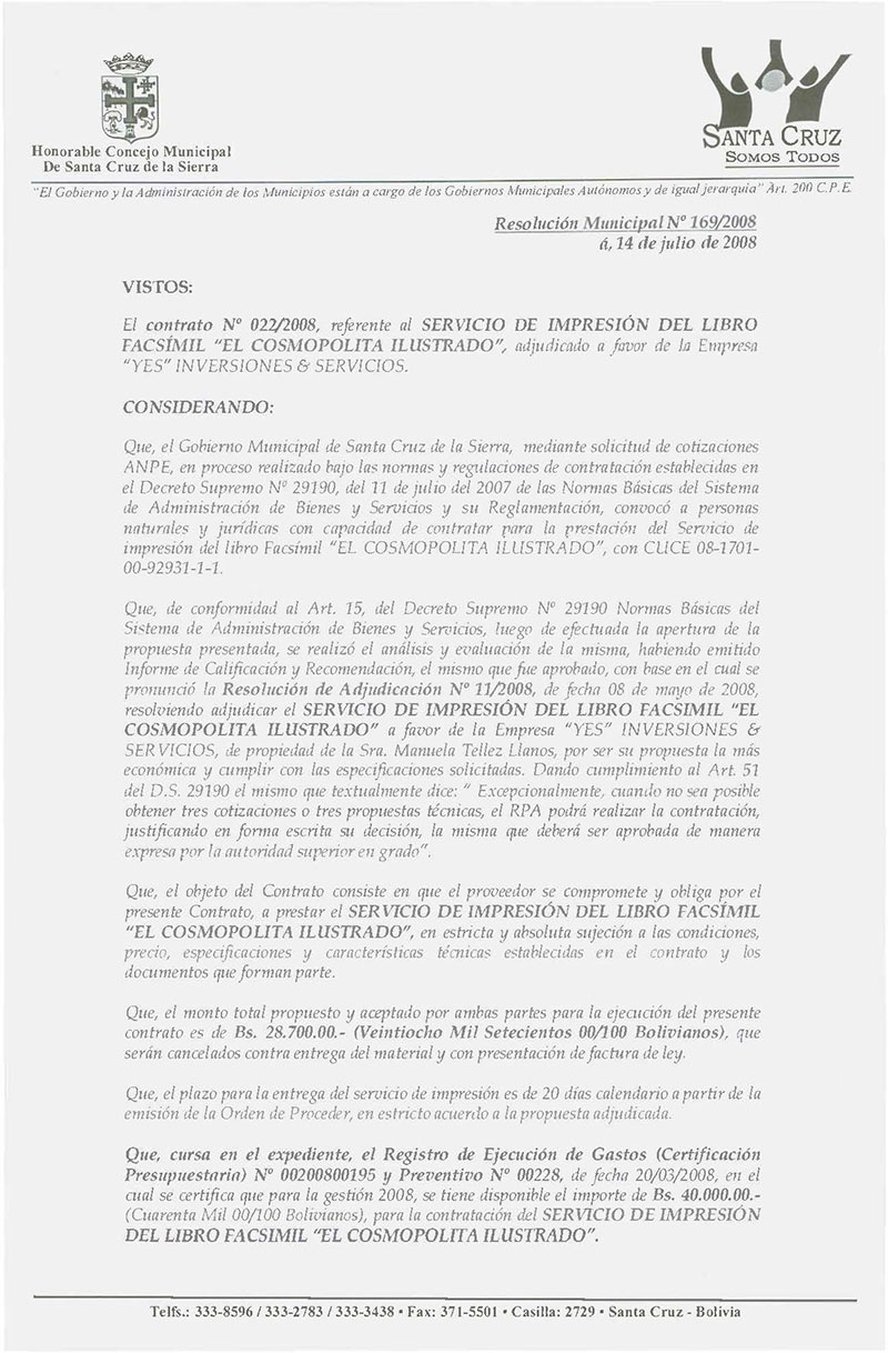 Aprueba el Contrato Nº 022/2008, referente al SERVICIO DE IMPRESIÓN DEL LIBRO FACSÍMIL “EL COSMOPOLITA ILUSTRADO”, adjudicado a favor de la Empresa “YES” INVERSIONES.