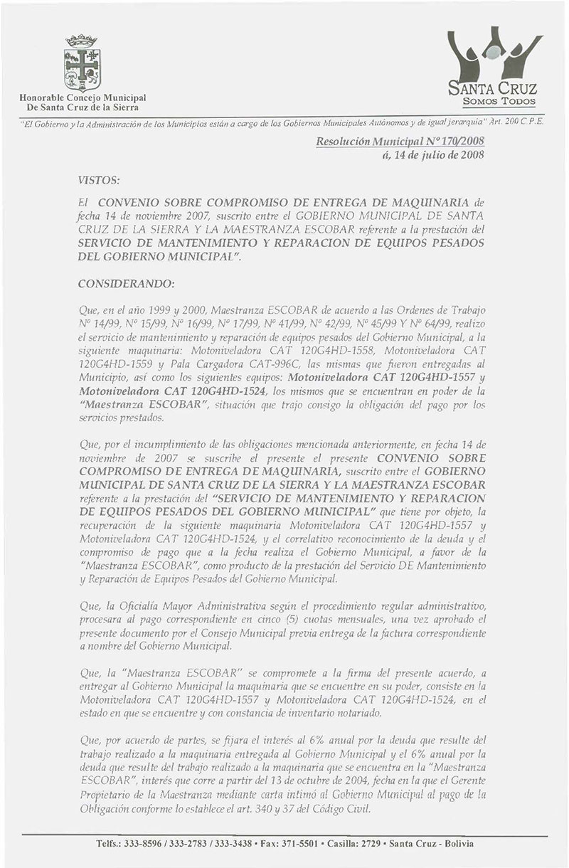 Aprueba el CONVENIO DE COMPROMISO DE ENTREGA DE MAQUINARIA de fecha 14 de noviembre de noviembre de 2007, por el monto total de $us. 24.525.98.-(Veinticuatro Mil Quinientos Veinte Cinco 98/100 Dólares Americanos) por la prestación del “SERVICIO DE MANTENIMIENTO Y REPARACIÓN DE EQUIPOS PESADOS DEL GOBIERNO MUNICIPAL”.