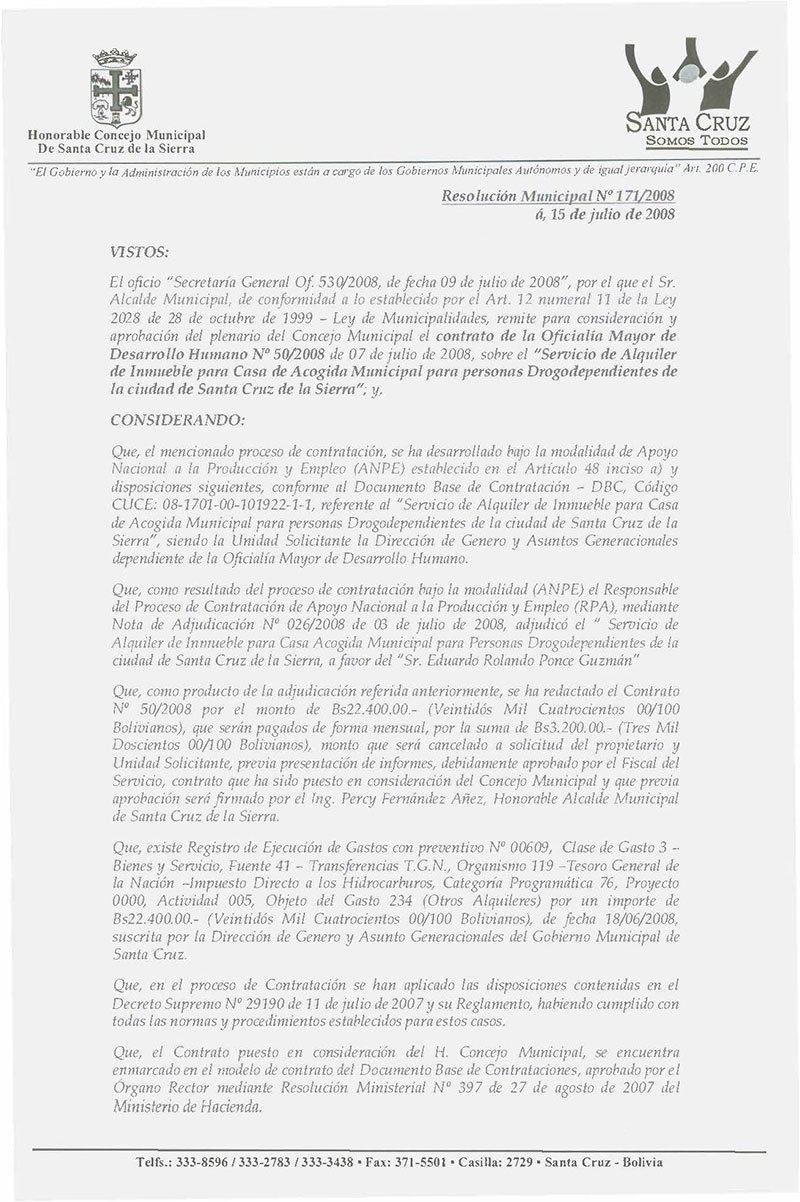 Aprueba el Contrato de la Oficialía Mayor de Desarrollo Humano Nº 50/2008 de 07 de julio de 2008, por el monto total de Bs. 22.400.00 (Veintidós Mil Cuatrocientos 00/100 Bolivianos), para el “Servicio de Alquiler de Inmueble para Casa de Acogida Municipal para personas Drogodependientes de la ciudad de Santa Cruz de la Sierra”, adjudicado al Arrendador Sr. Eduardo Rolando Ponce Guzmán.