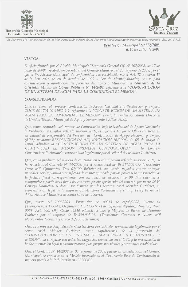 Aprueba el Contrato 14/2008, por el monto total de de Bs. 311.503.07.- (Trescientos Once Mil Quinientos Tres 07/100 Bolivianos), para la “CONSTRUCCIÓN DE UN SISTEMA DE AGUA PARA LA COMUNIDAD EL MESON”.