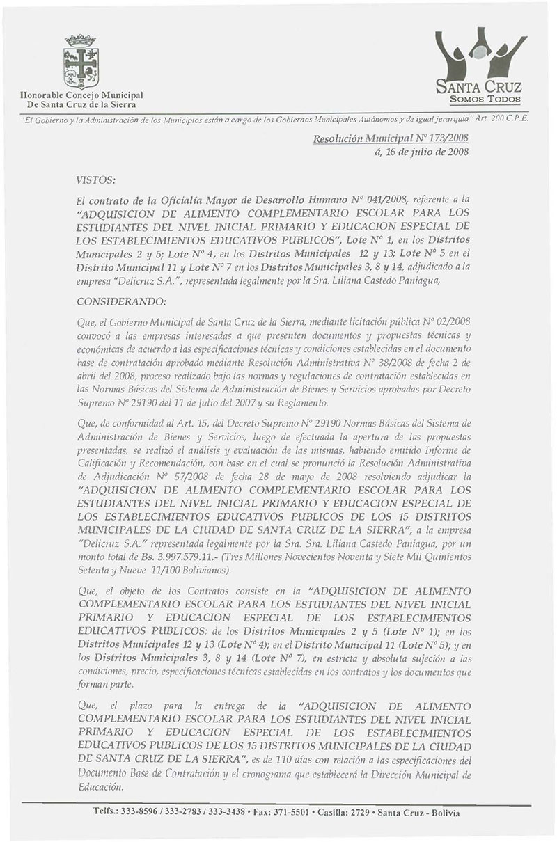 Aprueba el Contrato de la Oficialía Mayor de Desarrollo Humano Nº 041/2008, referente a la “ADQUISICIÓN DE ALIMENTO COMPLEMENTARIO ESCOLAR PARA LOS ESTUDIANTES DEL NIVEL INICIAL PRIMARIO Y EDUCACIÓN ESPECIAL DE LOS ESTABLECIMIENTOS EDUCATIVOS PÚBLICOS”, adjudicado a la Empresa “Delicruz S.A.”, por el importe de Bs. 3.997.579.11 (Tres Millones Novecientos Noventa y Siete Mil Quinientos Setenta y Nueve 11/100 Bolivianos).