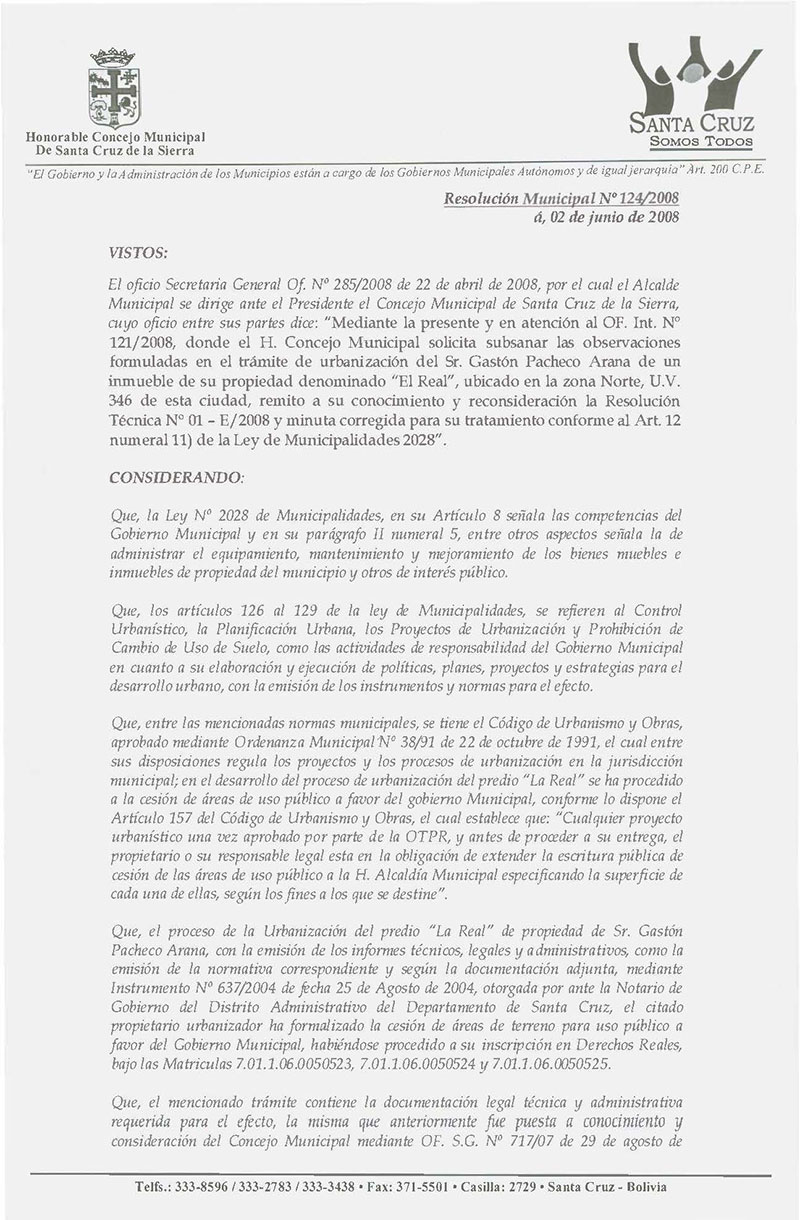 Aprueba la Minuta de Aclarativa de Límites y Colindancias de terreno para uso público cedidos por el Sr. Gastón Pacheco Arana, al Gobierno Municipal, de fecha 8 de Abril de 2008, comprendido en el predio del mencionado propietario urbanizador, denominado “La Real” en la Unidad Vecinal 346, según los planos, informes y normas técnicas y administrativas emitidas y aprobadas por el Órgano Ejecutivo Municipal.
