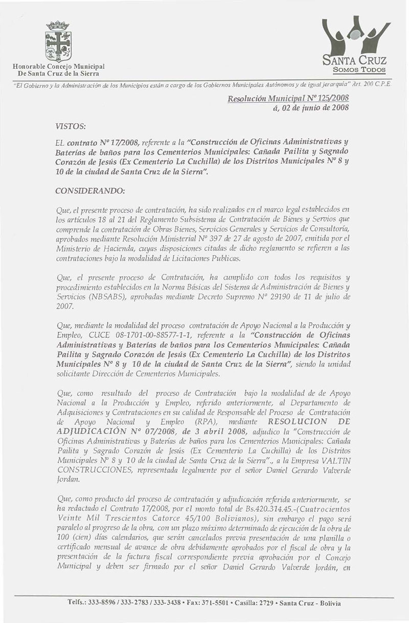 Se aprueba el Contrato Nº 17/2008, por el monto total de Bs. 420.314.45.- (Cuatrocientos Veinte Mil Trescientos Catorce 45/1000 Bolivianos), para la “Construcción de Oficinas Administrativas y Baterías de baños para los Cementerios Municipales: Cañada Pailita y Sagrado Corazón de Jesús (Ex Cementerio La Cuchilla) de los Distritos Municipales Nº 8 y 10 de la ciudad de Santa Cruz de la Sierra” a suscribirse entre el Señor Daniel Gerardo Valverde Jordán representante legalmente de la Empresa VALTIN CONSTRUCCIONES.
