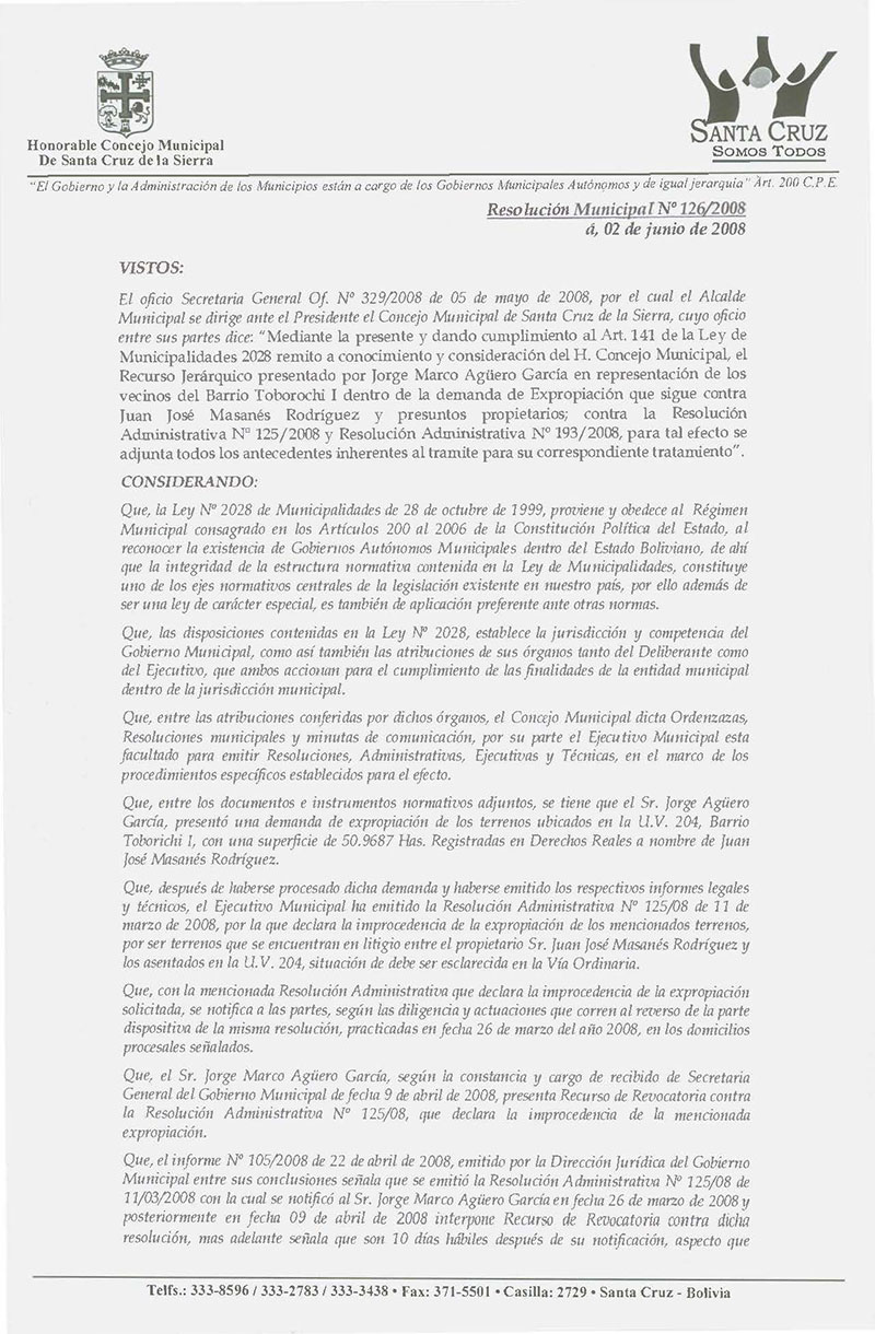 Confirma en todas sus partes la Resolución Administrativa Nº 193/2008 de 22 de abril de 2008, emitida por el Alcalde Municipal de Santa Cruz de la Sierra, relativo a una demanda de expropiación de los terrenos ubicados en la U.V. 204, Barrio Toborochi I.