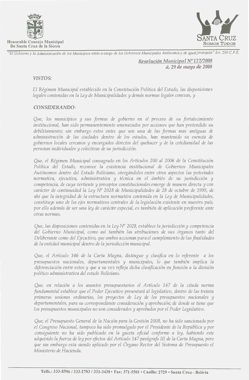 Instruir al Ejecutivo Municipal que de manera inmediata proceda a la defensa de la Autonomía Municipal ejecutando e instaurando todas las acciones y medidas necesarias sean estas de carácter constitucional, judicial, administrativa y/o social, contra cualquier acto que amenace, dañe, debilite, vulnere, contravenga y/o viole a la normativa municipal y a la institucionalidad del Gobierno Municipal de Santa Cruz de la Sierra.