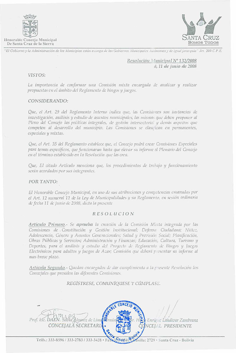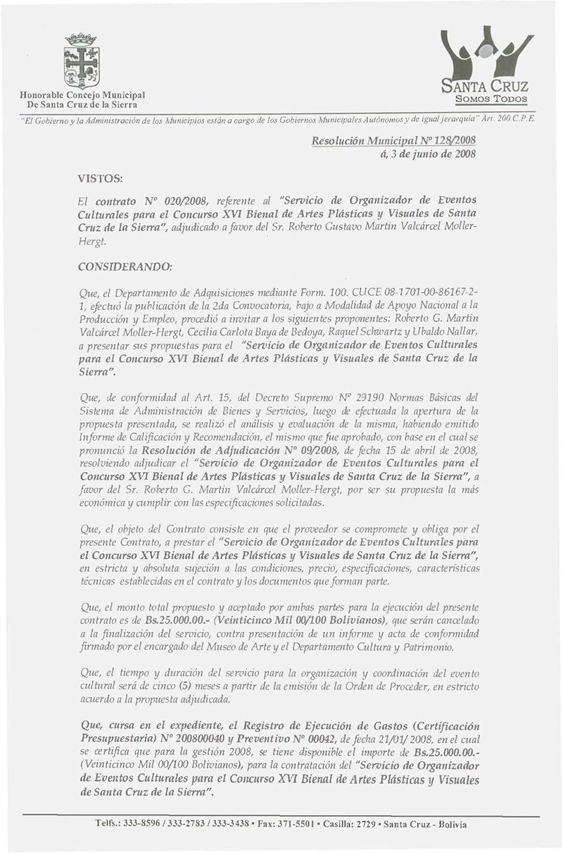 Aprueba el Contrato Nº 020/2008, referente al “Servicio de Organizador de Eventos Culturales para el Concurso XVI Bienal de Artes Plásticas y Visuales se Santa Cruz de la Sierra”, adjudicado al Sr. Roberto Gustavo Martin Valcárcel Moller-Hergt, por un monto de Bs. 25.000.00.- (Veinticinco Mil 00/100 Bolivianos).