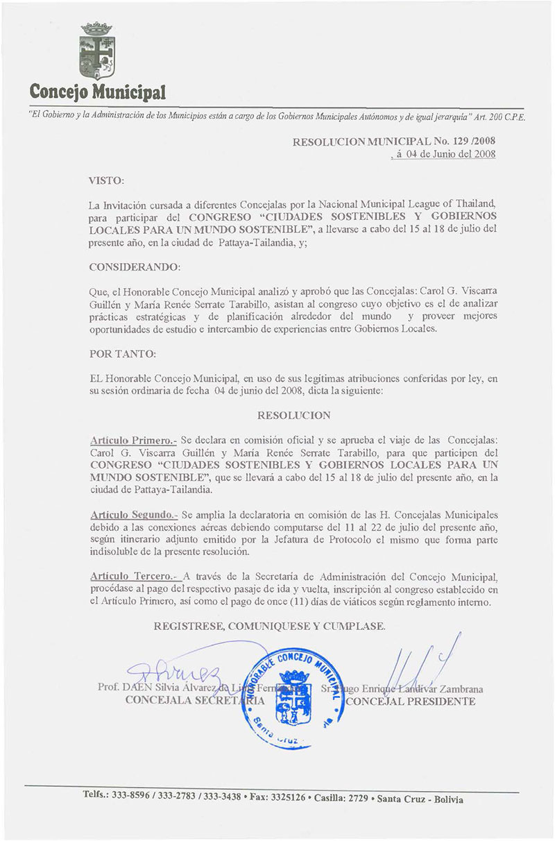 Declara en comisión oficial y se aprueba el viaje de las Concejalas Carol G. Viscarra Guillén y María Reneé Serrate Tarabillo, para que participen del Congreso "Ciudades Sostenibles y Gobiernos Locales para un Mundo Sostenible", a realizarse en la Ciudad de Pattaya - Tailandia.