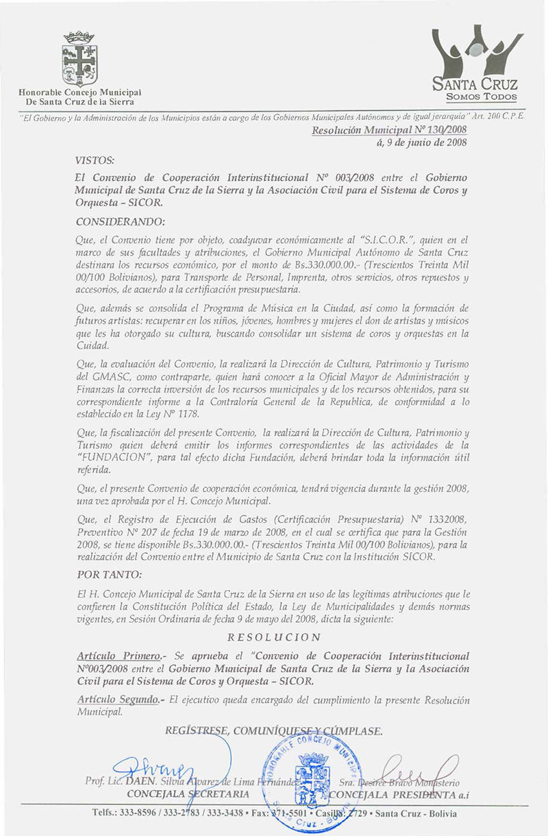 Aprueba el “Convenio de Cooperación Interinstitucional Nº 003/2008 entre el Gobierno Municipal de Santa Cruz de la Sierra y la Asociación Civil para el Sistema de Coros y Orquesta – SICOR.