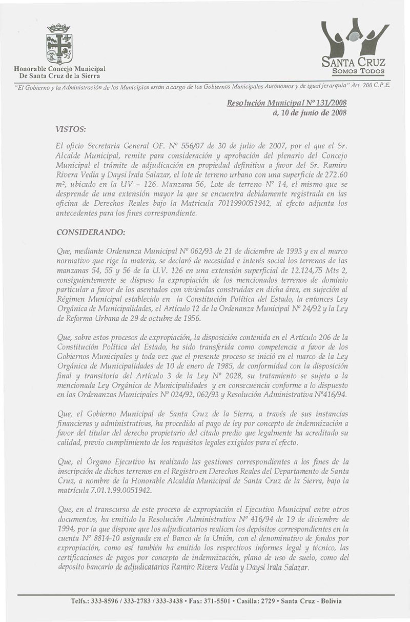 Aprobar la Minuta de adjudicación definitiva de 16 de agosto de 2006 que cursa en el expediente, a favor de los señores Ramiro Rivera Vedia y Daysi Irala Salazar, del lote de terreno ubicado en la UV: 126, Manzana 56, lote N° 14, con una superficie total de 272.60 m² y que se encuentra comprendido en la expropiación dispuesta por la Ordenanza Municipal Nº 062/93 de fecha 21 de diciembre de 1.993.
