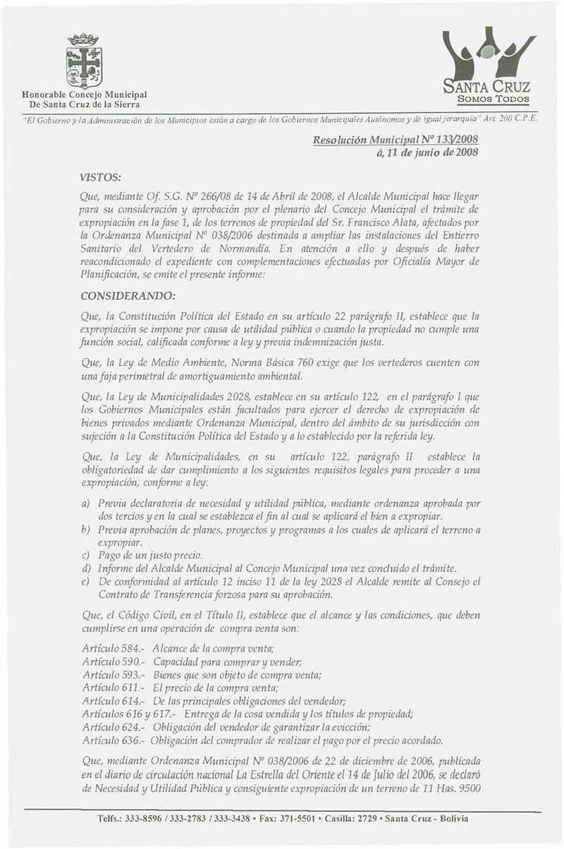 Se aprueba en todas sus cláusulas la minuta de transferencia de fecha 20 de febrero de 2008, por la que el Sr. Francisco Alata López, como emergencia de la fase 1 de la expropiación dispuesta por la Ordenanza Municipal 038/2006, transfiere a favor del Gobierno Municipal de Santa Cruz de la Sierra la superficie de terreno de 11 has 9.500 m², destinada a la ampliación de las instalaciones del Vertedero Municipal de Normandía, por la suma de Bs. 845.139.99.- (Ochocientos Cuarenta y Cinco Mil Ciento Treinta y Nueve 99/100 Bolivianos).