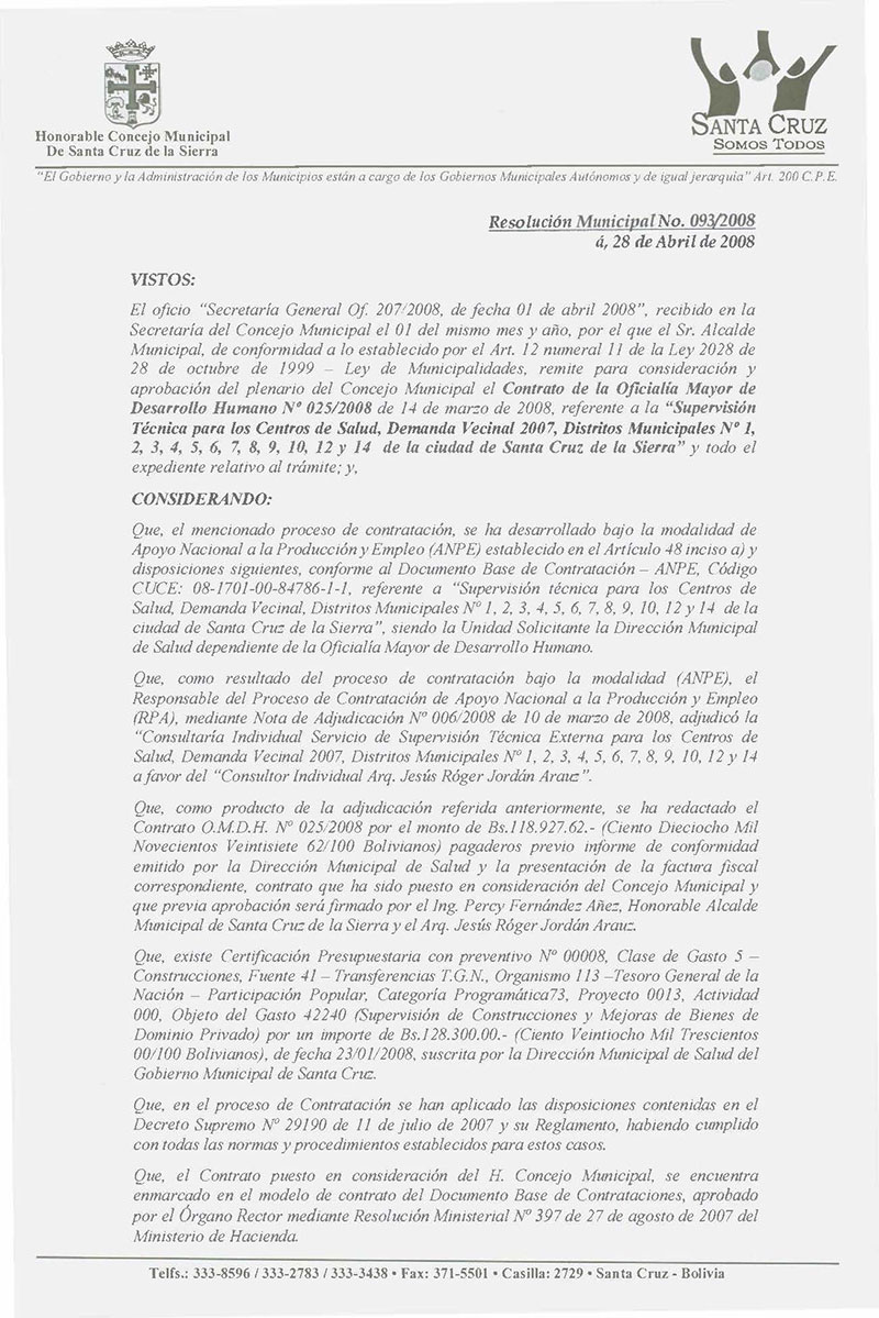Aprueba el Contrato de la Oficialía Mayor de Desarrollo Humano Nº 025/2008 de 14 de marzo de 2008, por el valor de Bs.118.927.62.- (Ciento Dieciocho Mil Novecientos Veintisiete 62/100 Bolivianos), para la “Supervisión Técnica para los Centros de Salud Demanda Vecinal 2007, Distritos Municipales Nº 1, 2, 3, 4, 5, 6, 7, 8, 9, 10, 12 y 14 de la ciudad de Santa Cruz de la Sierra” adjudicado al “Consultor Individual Arq. Jesús Róger Jordán Arauz”.