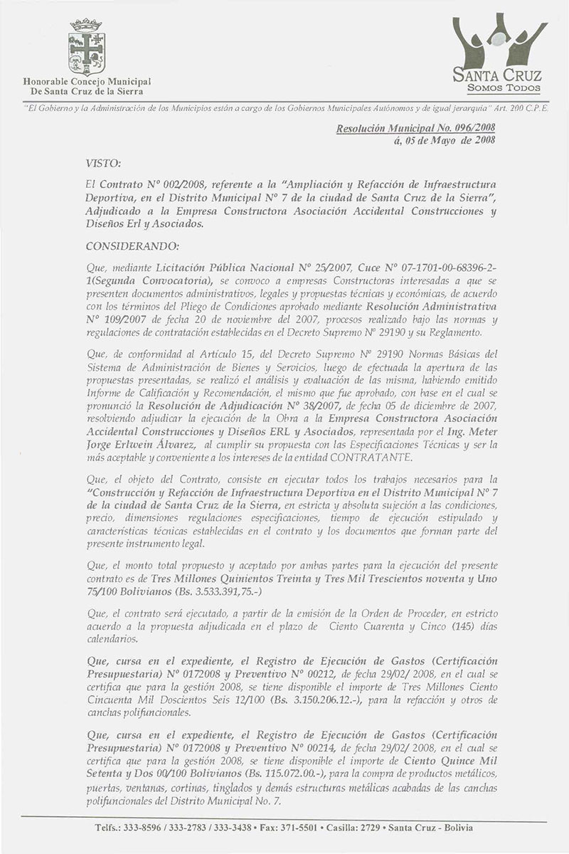Aprueba el Contrato Nº 002/2008, referente a la “Ampliación y Refacción de Infraestructura Deportiva, en el Distrito Municipal Nº 7 de la ciudad de Santa Cruz de la Sierra”, por un monto de Bs. 3.533.391,75 (Tres Millones Quinientos Treinta y Tres Mil Trescientos Noventa y Uno 75/100 Bolivianos), Adjudicado a la Empresa Constructora Asociación Accidental Construcciones Y Diseños ERL y Asociados.