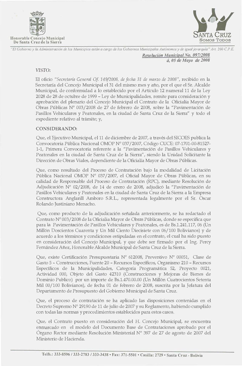 Aprueba el Contrato de la Oficialía Mayor de Obras Públicas Nº 03/2008, para la "Pavimentación de Pasillos Vehículares y Peatonales en la ciudad de Santa Cruz de la Sierra" por el monto de Bs. 1.241.117,06 (Un Millón Doscientos Cuarenta y un Mil Ciento Diecisiete con 06/100), adjudicado a la Empresa Constructora Anglarill Amboro S.R.L,.