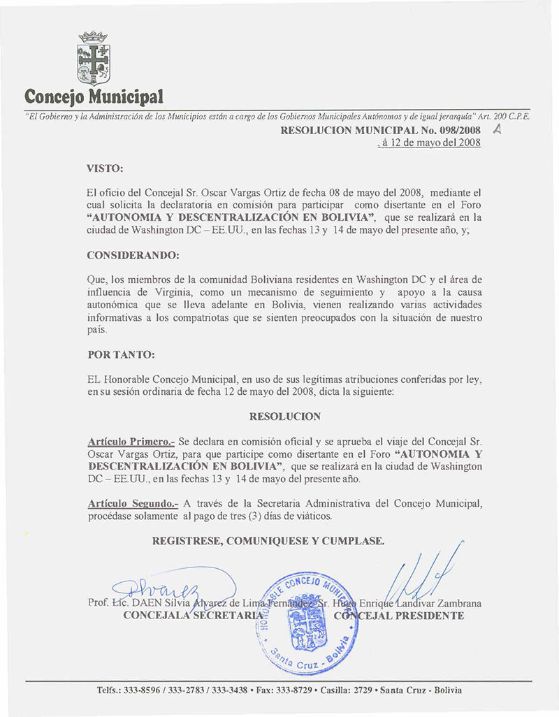 Declara en Comisión Oficial y aprueba el viaje del Concejal Sr. Oscar Vargas Ortíz, para que participe como disertante en el FORO AUTONOMÍA Y DESCENTRALIZACION EN BOLIVIA que se realizará en la ciudad de Washington DC. - EEUU, en las fechas 13 y 14 de mayo del presente año.